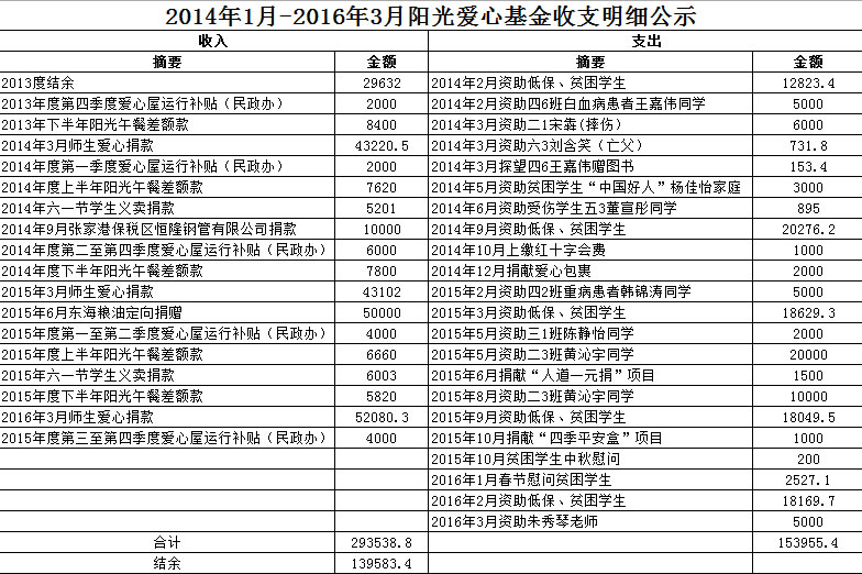 2014年1月-2016年3月阳光爱心基金收支明细公示
