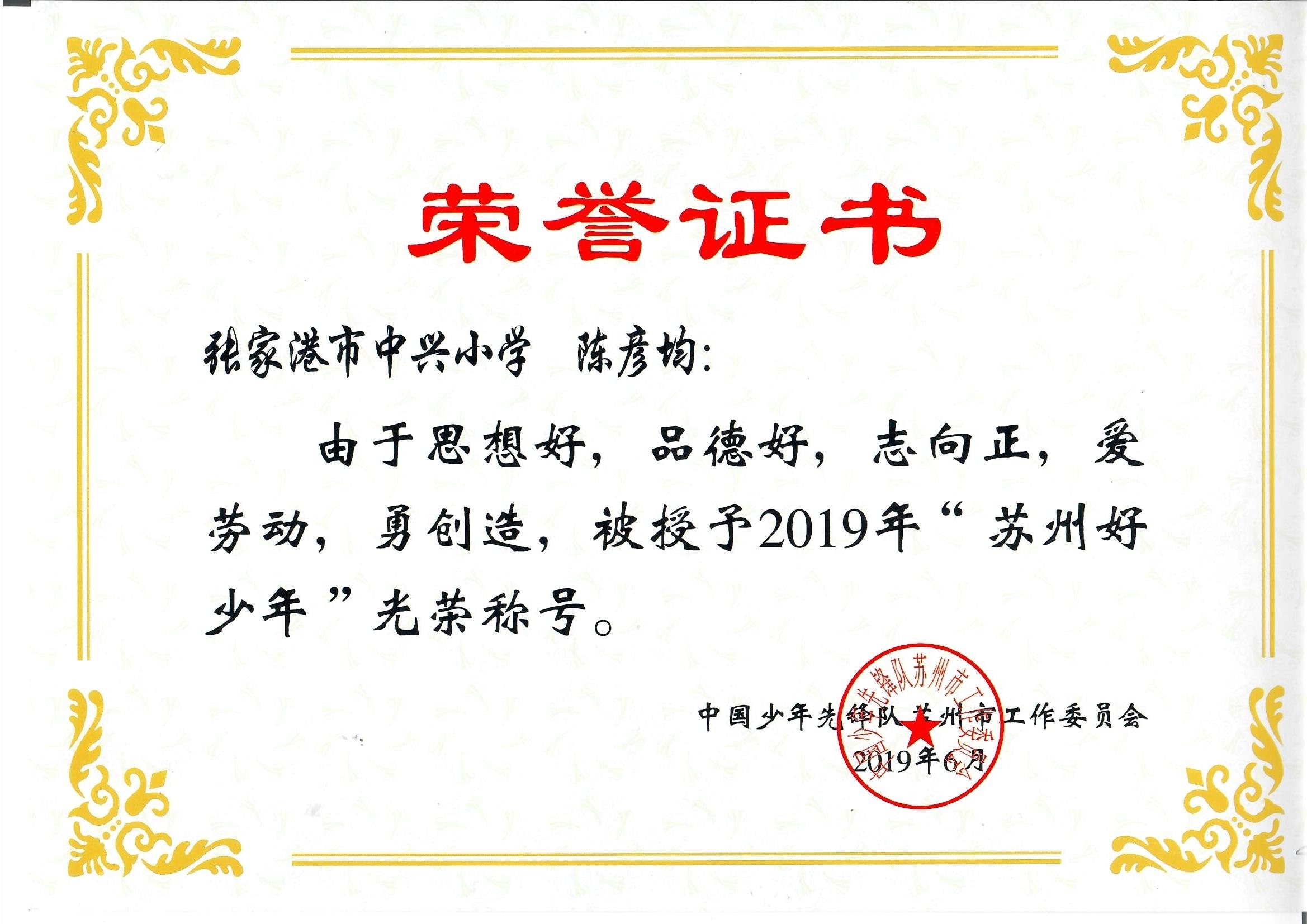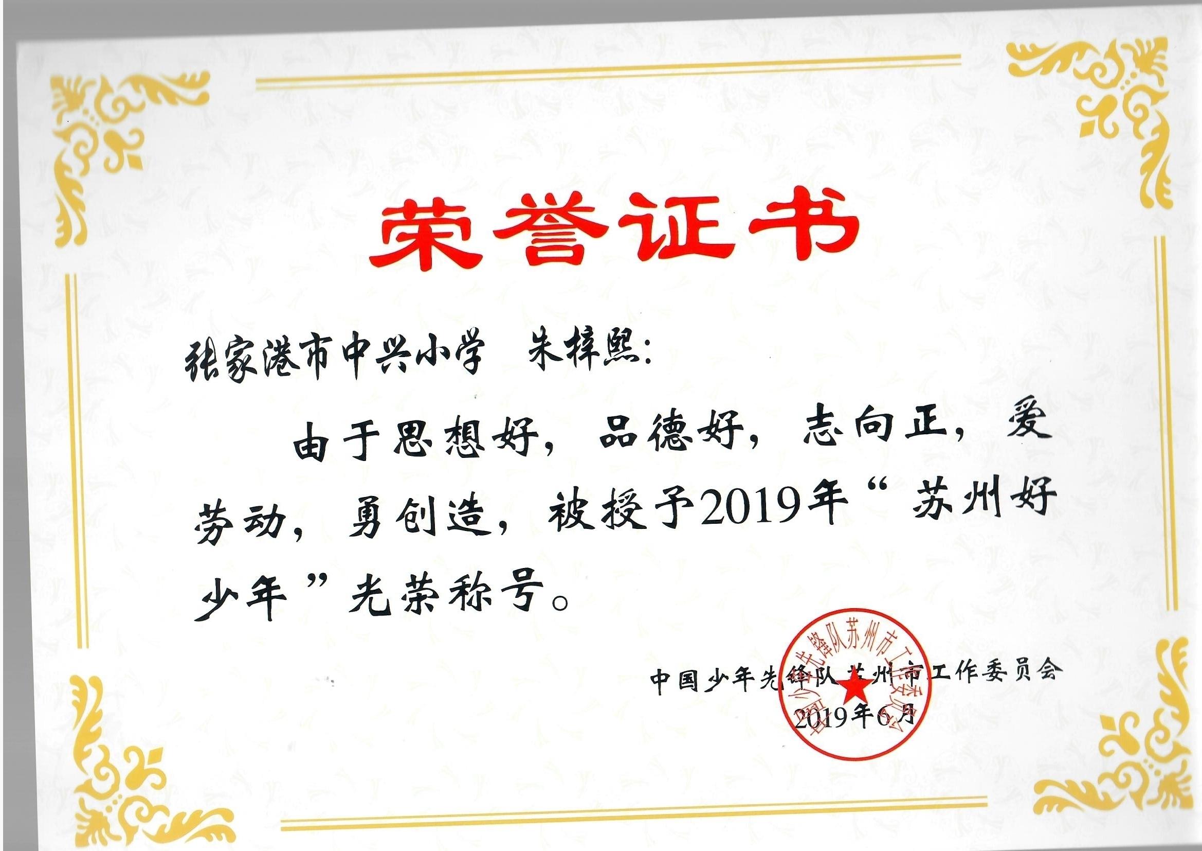 热烈祝贺我校陈彦均、朱梓熙同学荣获“2019年苏州好少年”