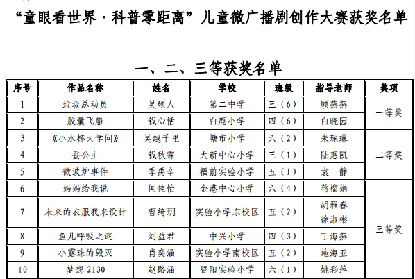 祝贺中兴小学四(3)班刘益君同学在张家港市“童眼看世界 科普零距离”儿童微广播剧创作大赛中荣获三等奖 来源:中兴小学 发布时间:2015-12-02 00:00:00 浏览次数: 次 【字体:小 大】 分享到: 【打印正文】