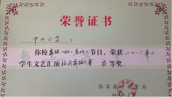 祝贺我校舞蹈《妞妞看戏》荣获小学生文艺汇演校园舞蹈大赛三等奖