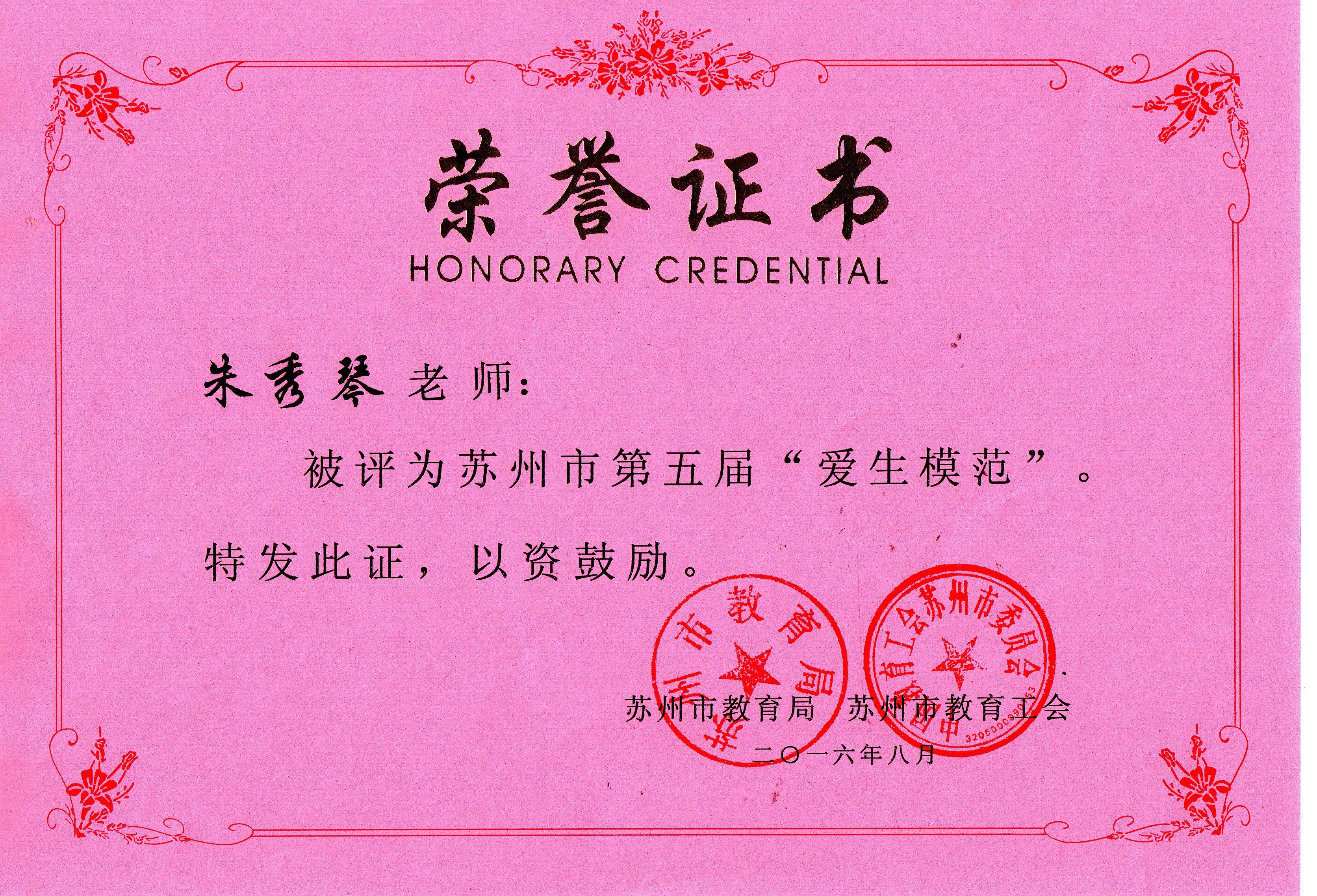 热烈祝贺中兴小学朱秀琴老师获得苏州市第五届“爱生模范”光荣称号