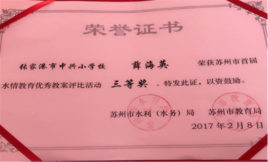 祝贺我校薛海英老师在苏州市首届水情教育优秀教案评比活动中获奖 来源: 发布时间:2017-03-29 00:00:00 浏览次数: 次 【字体:小 大】 祝贺我校薛海英老师在苏州市首届水情教育优秀教案评比活动中获奖 在由苏州市水利局和苏州市教育局联合举办的第五届《我的天堂我的水》芬欧汇川征文活动中,我校薛海英老师荣获苏州市首届水情教育优秀教案评比活动三等奖。 分享到: 【打印正文】