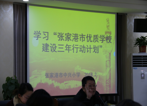 第二个议程是由严卫星书记传达教育局关于印发《张家港市优质学校建设三年行动计划》通知精神。文件中指出优质学校建设是学校发展的重要过程和主要目标,是新时代建办公平而有质量教育的重要支撑。文件中还提出了未来三年的六项行动计划。一是学校文化引领活动,二是教育治理提升行动,三是课程改革深化行动,四是优秀教师领航行动,五是智慧教育创新行动,六是集群协同发展活动。